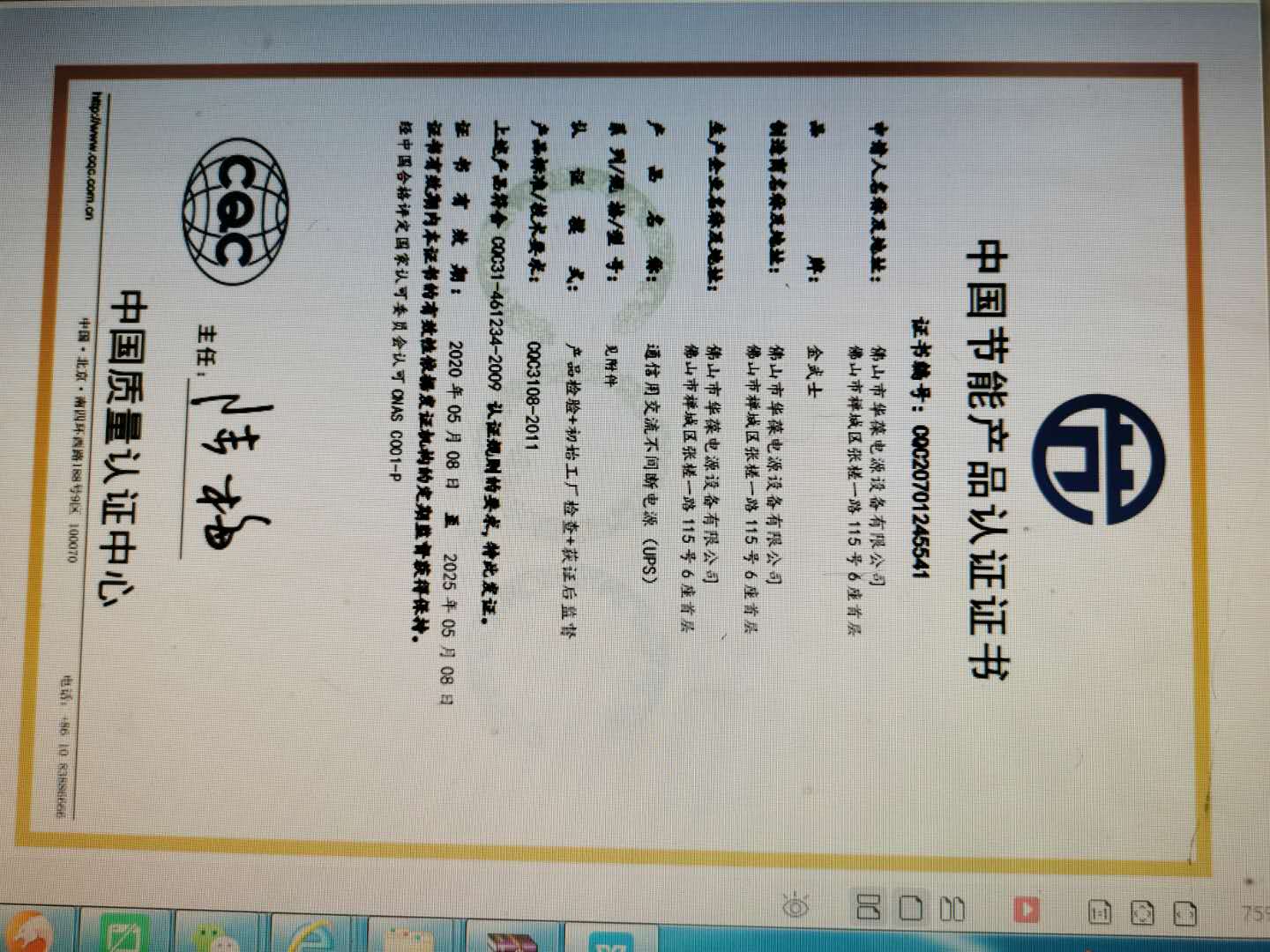 2020年5月9日,佛山市華葆電源設備有限公司又迎來重大喜訊:旗下UPS電源品牌“金武士”系列產(chǎn)品全部以優(yōu)異的節(jié)能技術和實用性獲得中國質量認證中心(CQC)頒發(fā)的中國節(jié)能產(chǎn)品認證證書。CQC節(jié)能認證再一次確認了華葆電源金武士UPS電源產(chǎn)品的優(yōu)秀,持續(xù)為廣大的用戶帶去更高節(jié)能效果。